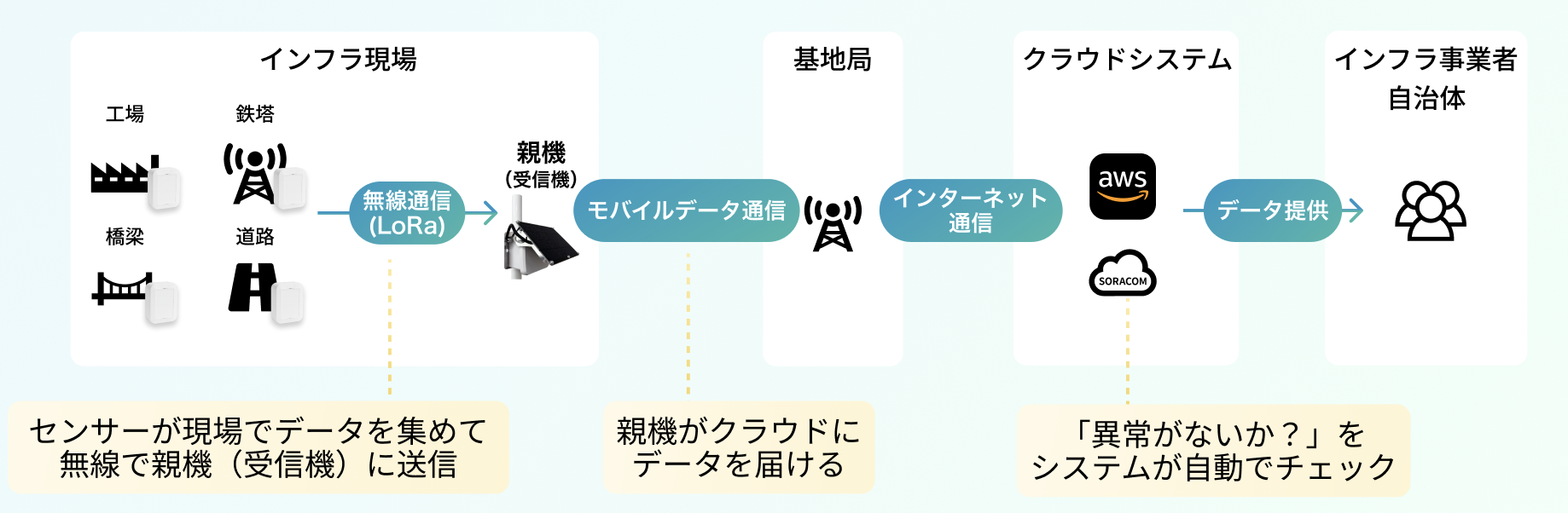 LoRa通信を使ったIoTシステムでは、センサーが取得したデータがどのような経路でクラウドに届くのか。当社ミットディアのインフラ監視システムを例にして全体の流れを見てみましょう。